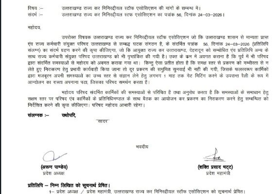 देहरादून 05 अप्रैल 2026। राज्य कर्मचारी संयुक्त परिषद उत्तराखंड के प्रदेश अध्यक्ष अरुण पांडे ने कहा कि उत्तराखंड राज्य कर मिनिस्ट्रीयल स्टाफ एसोसिएशन, जो कि परिषद का घटक सदस्य संगठन है, के मांग पत्र में प्रमुख रूप से राज्य कर मिनिस्ट्रीयल कार्मिकों के नए ढांचे के निर्धारण, एवं राज्य कर अधिकारी सेवा नियमावली में संशोधन…