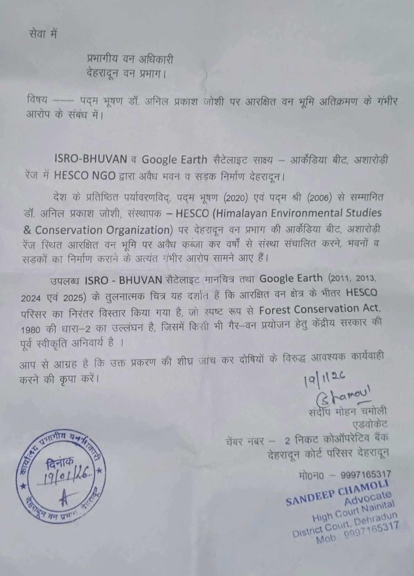 उत्तराखंड वन विभाग के प्रभागीय वन अधिकारी (डिविजनल फॉरेस्ट ऑफिसर) ने 18 जनवरी 2026 को डॉ. अनिल जोशी को नोटिस जारी किया।