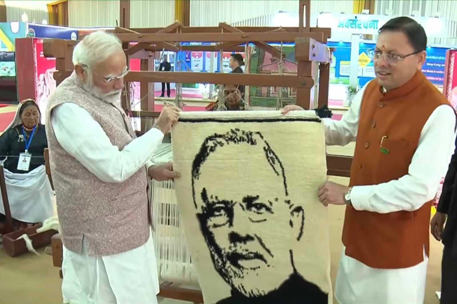 हाथों से बुनी प्रधानमंत्री नरेंद्र मोदी की तस्वीर मुख्यमंत्री पुष्कर सिंह धामी ने आदरणीय प्रधानमंत्री को भेंट की।
