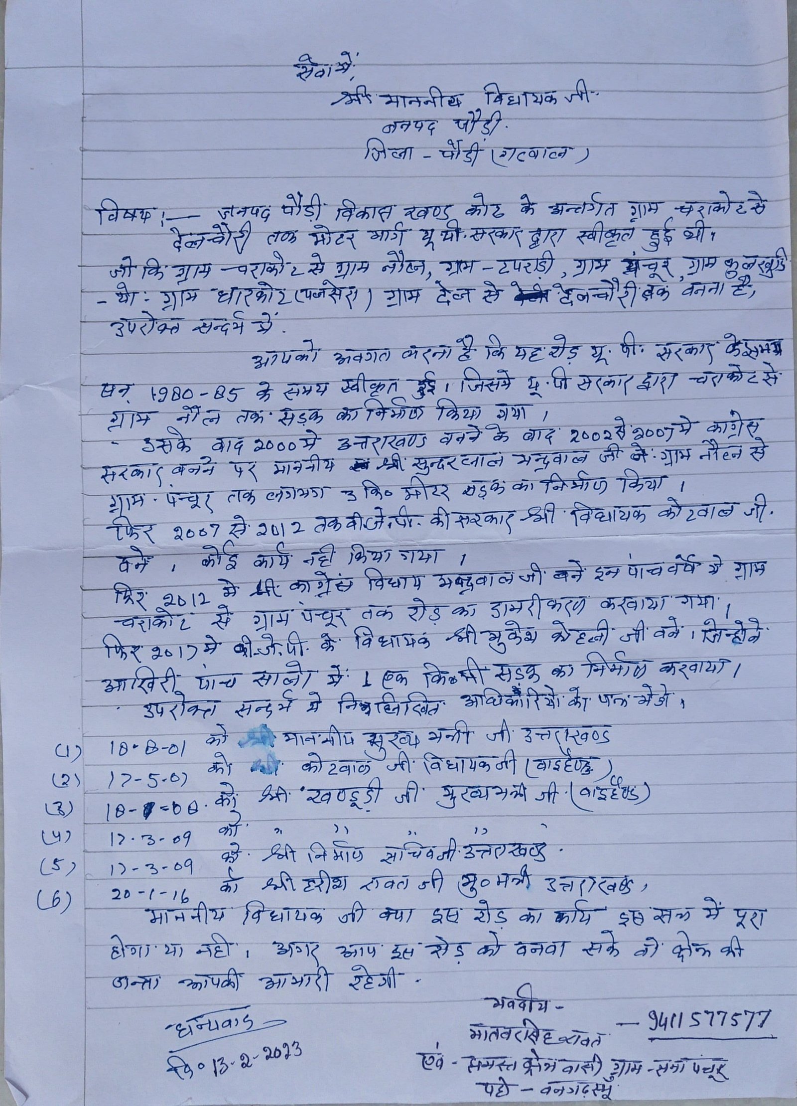 विधायक ने इस सड़क को पूर्ण करने की जहमत नहीं की ग्रामीणों ने नारायण दत्त तिवारी से लेकर खंडूरी, बहुगुणा सहित और जितने भी मुख्यमंत्री बने उनसे गुहार लगाई लेकिन उनकी गुहार को मुख्यमंत्री ने अनसुनी कर दी ग्रामीण बस इसी इंतजार में है कि उनकी यह सड़क उनके जीते जी बन जाए और बने तो उनका जीवन भी थोड़ा सा सुलभ हो जाए,