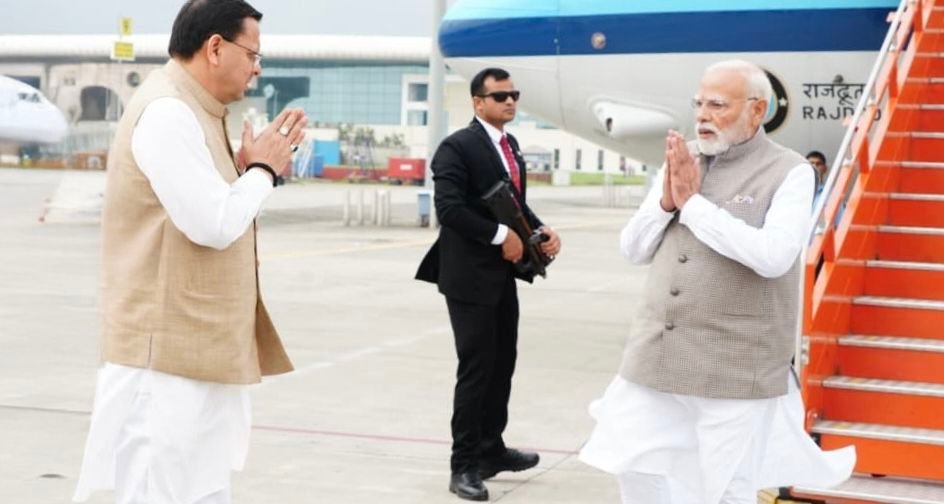 जॉली ग्रांट एयरपोर्ट पर मुख्यमंत्री पुष्कर सिंह धामी ने प्रधानमंत्री नरेंद्र मोदी का स्वागत किया।